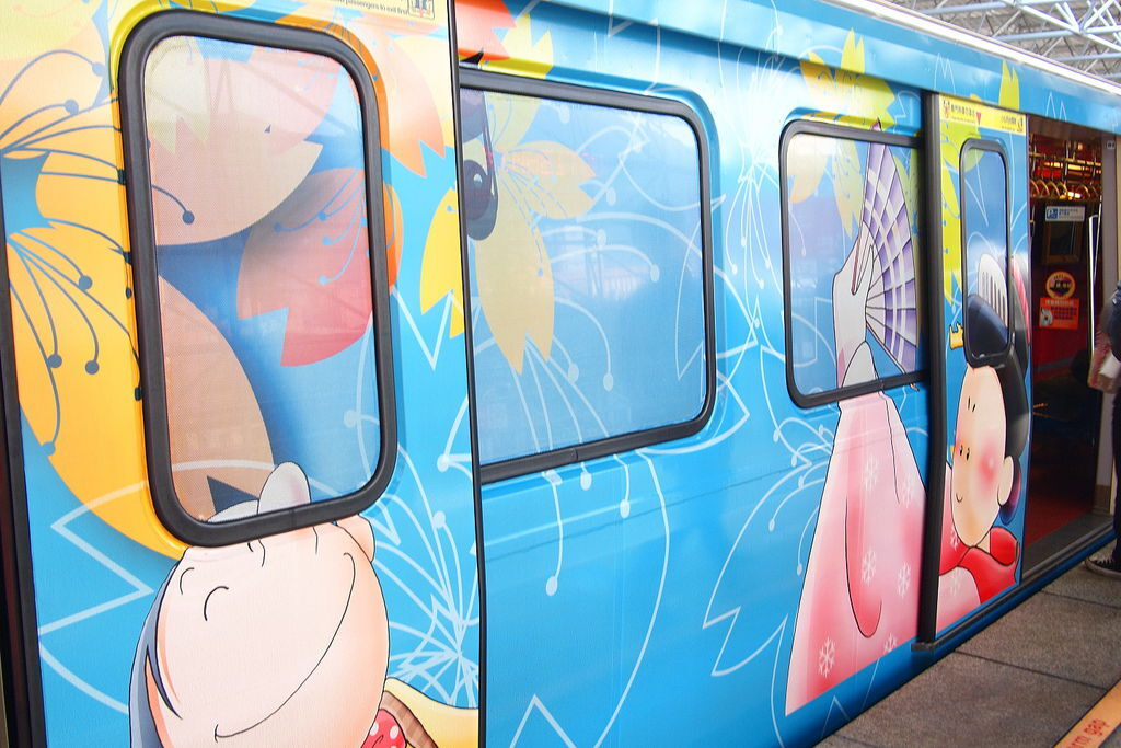 從北投轉往新北投的捷運,披著一身光鮮亮麗的彩衣。